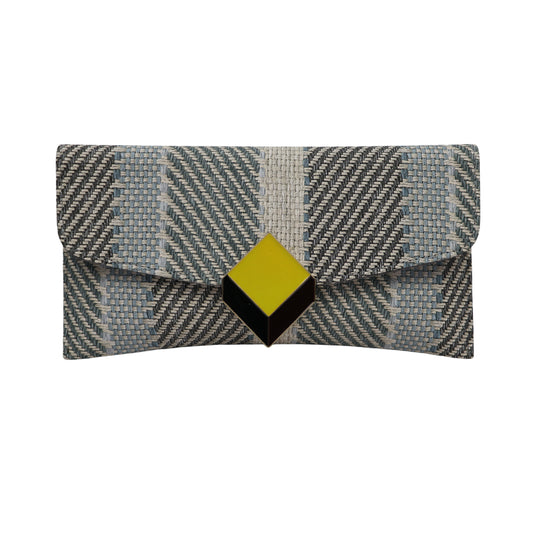 A modern handcrafted clutch with textured weave and bold metal detailing