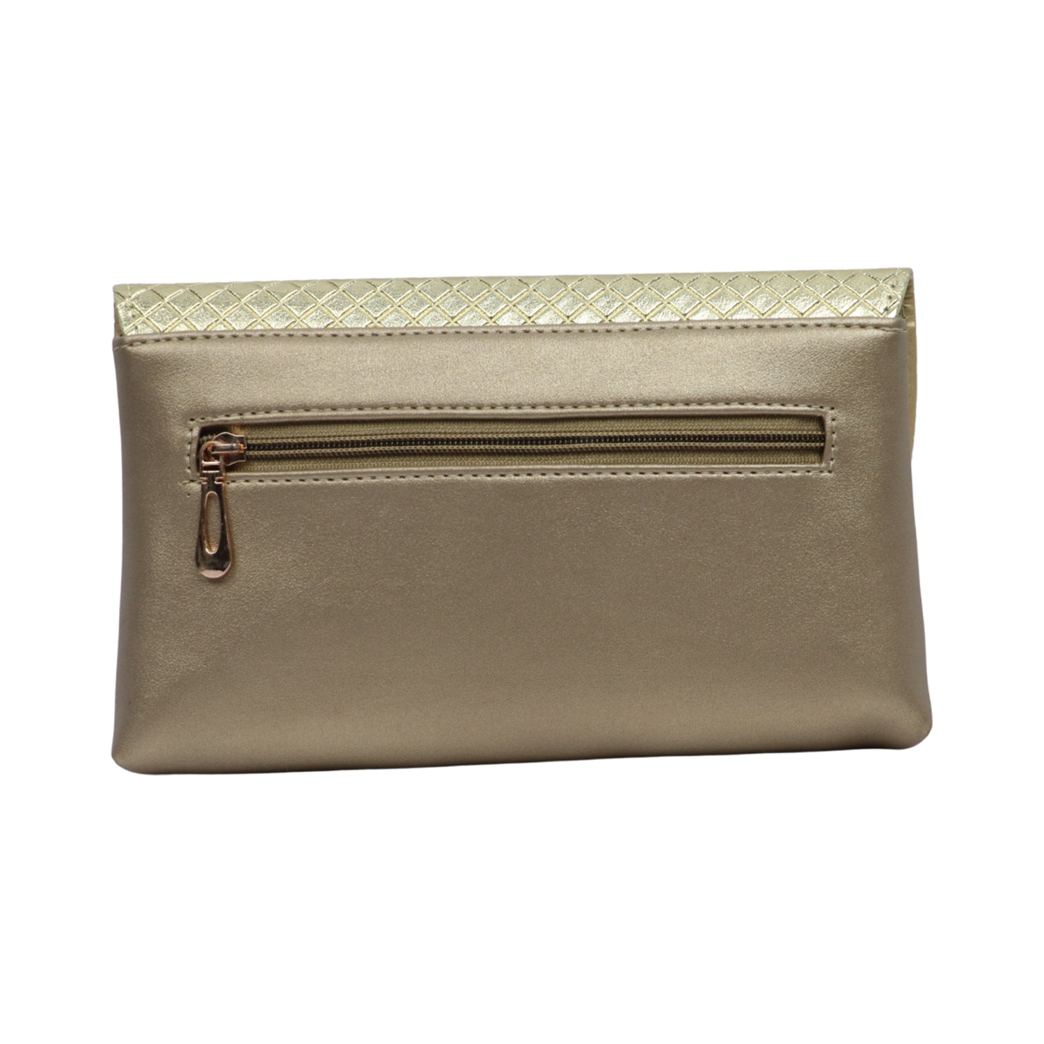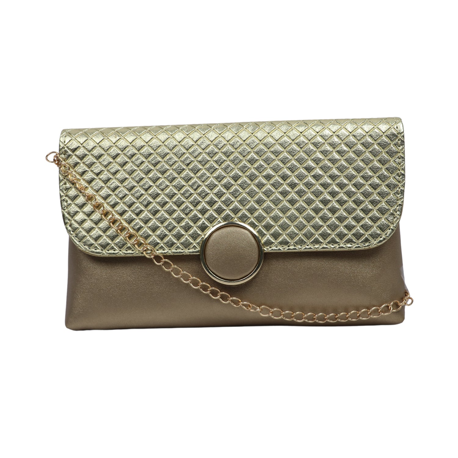 This metallic gold envelope clutch features a luxurious diamond-textured flap paired with a smooth satin-finish base, creating a perfect balance of shine and sophistication. The round metal accent on the front adds a refined focal point, while the detachable chain strap allows versatile styling as a sling or handheld clutch.