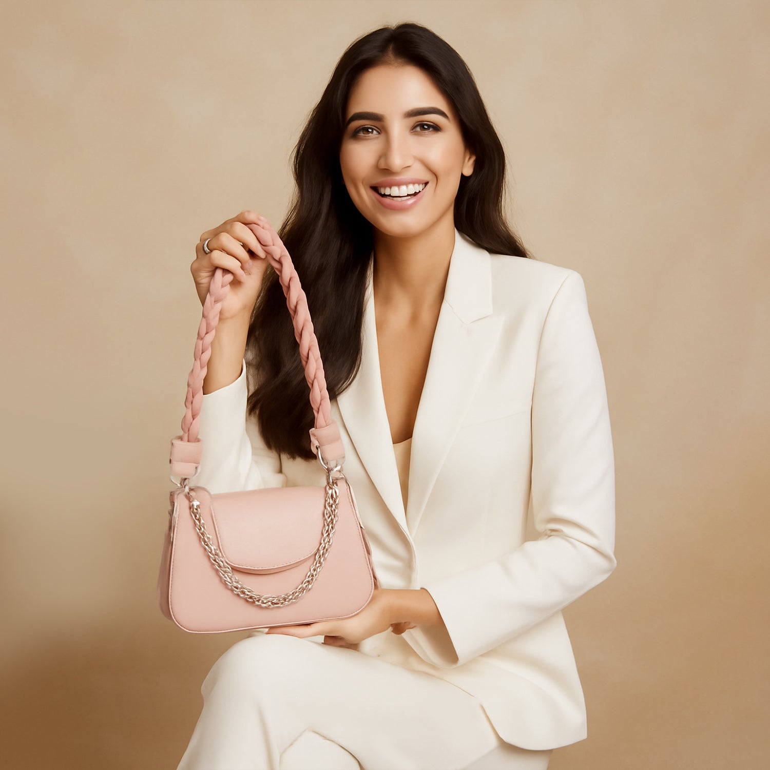 Elevate your everyday elegance with this Blush Braided Handle Shoulder Bag. Featuring a textured blush finish, braided top handle, and silver chain accent, this compact bag brings together feminine charm and modern flair.