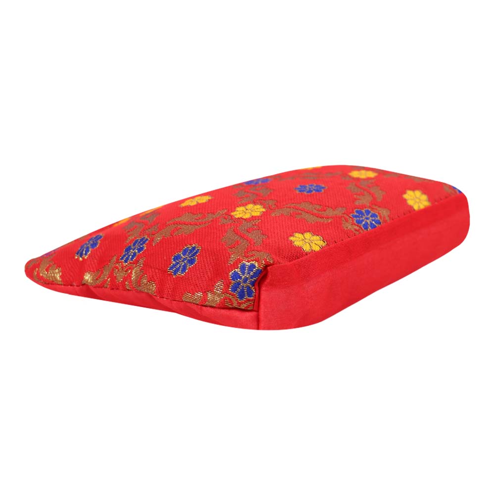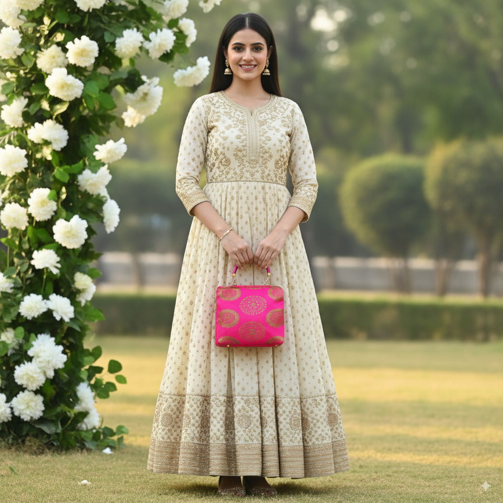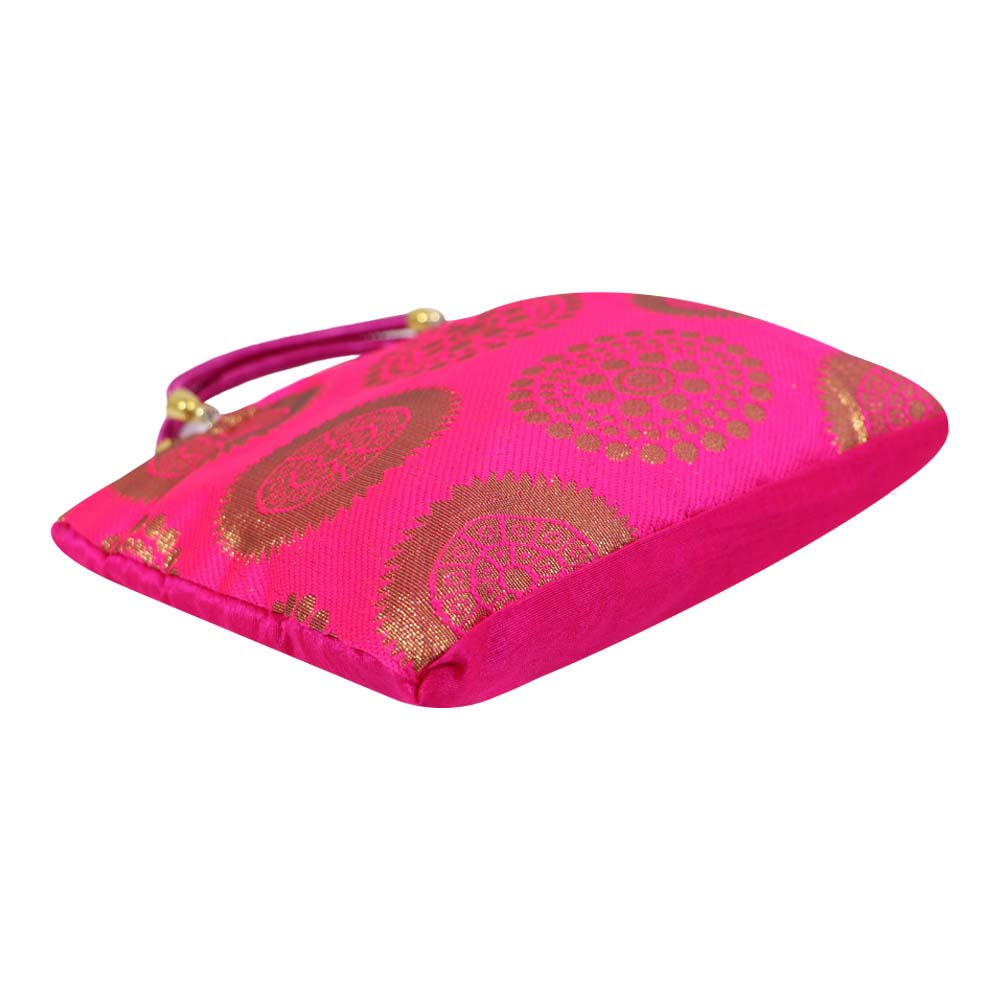 Elevate your style with this stunning brocade handbag featuring intricate circular motifs in metallic gold. The rich texture of the brocade fabric gives the bag a luxurious feel, while the sturdy wooden handles add a touch of sophistication.