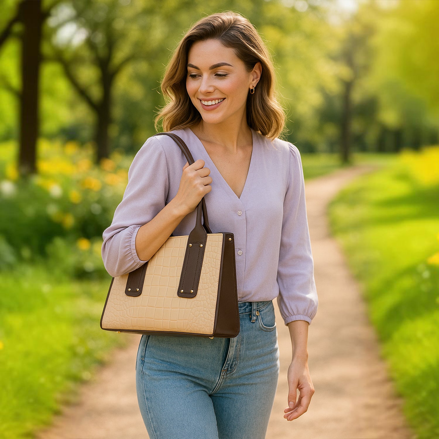 A stylish and elegant handbag, featuring a crocodile-embossed beige texture with chic brown handles.