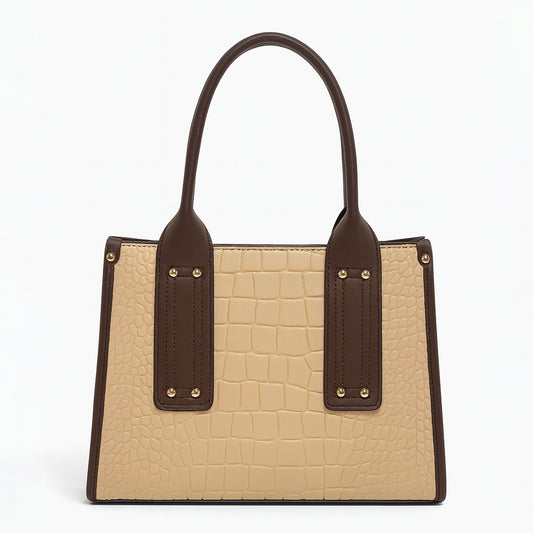 Make a bold fashion statement with this Rose Gold Structured Mini Handbag, featuring a unique geometric handle and a beautifully textured flap design.