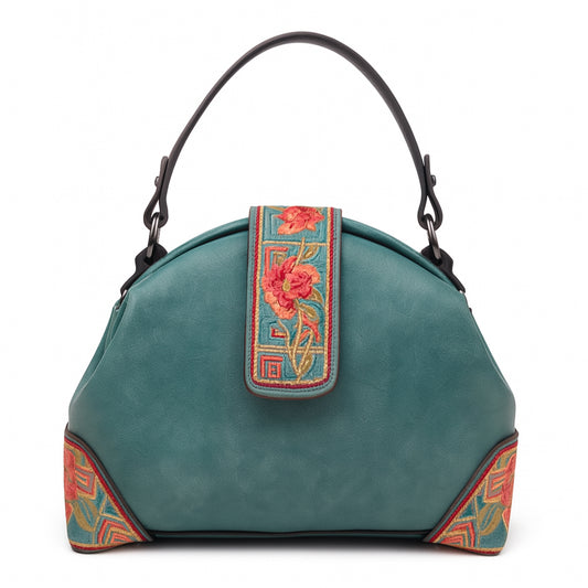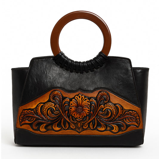 Vintage Leather Carved Floral Handle Bag with Round Resin Handle