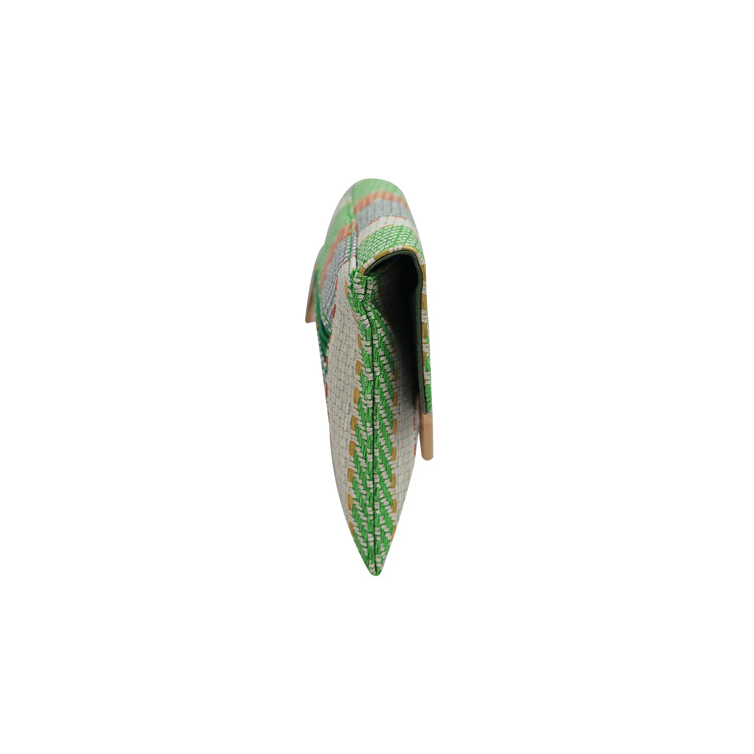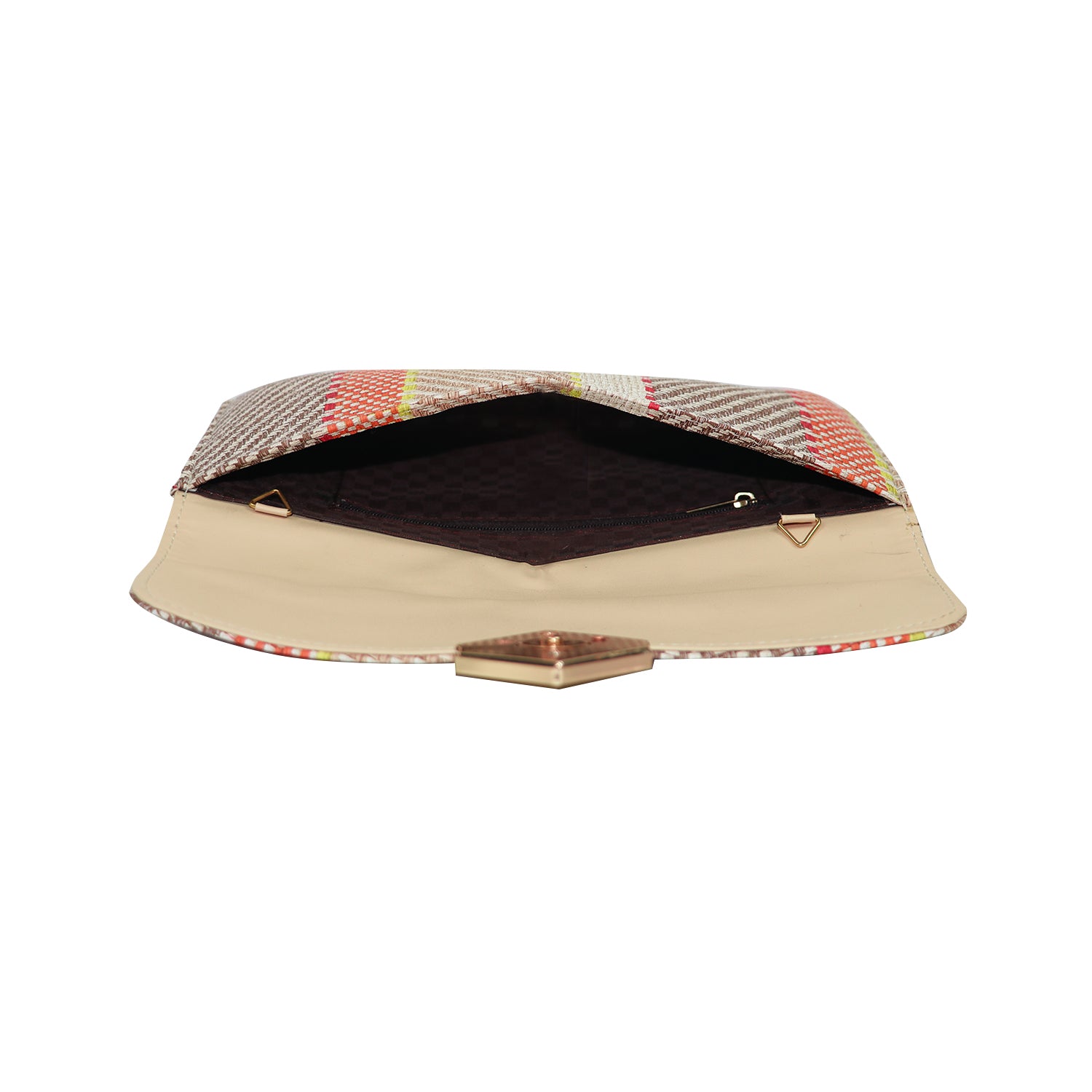 A stylish multi-color woven pattern clutch designed for women who love unique and modern accessories. The textured fabric pattern combined with a bold geometric metal clasp creates a fashionable statement piece