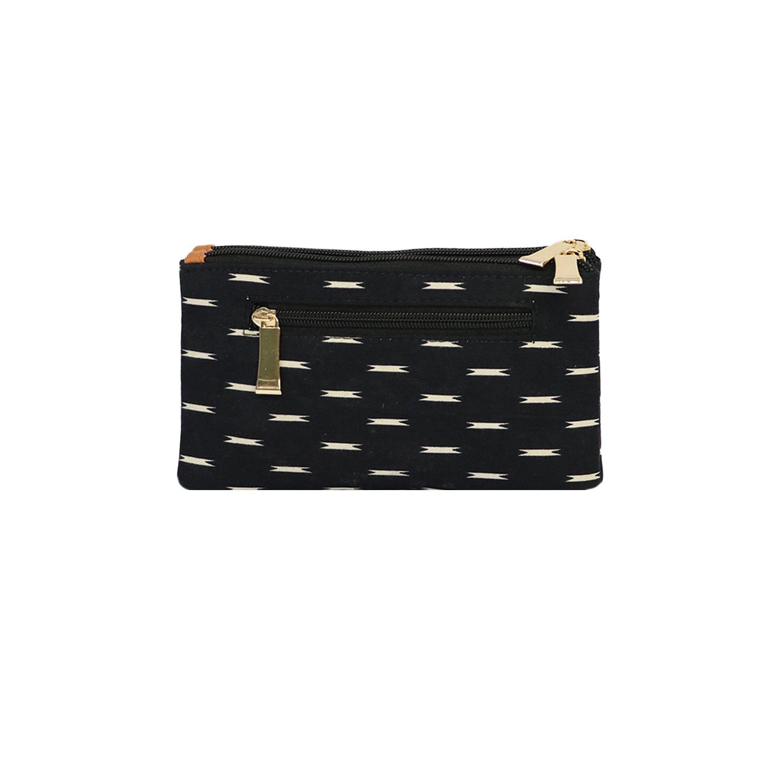 A stylish black printed clutch wallet designed with multiple zipper compartments and a detachable wrist strap for convenience.