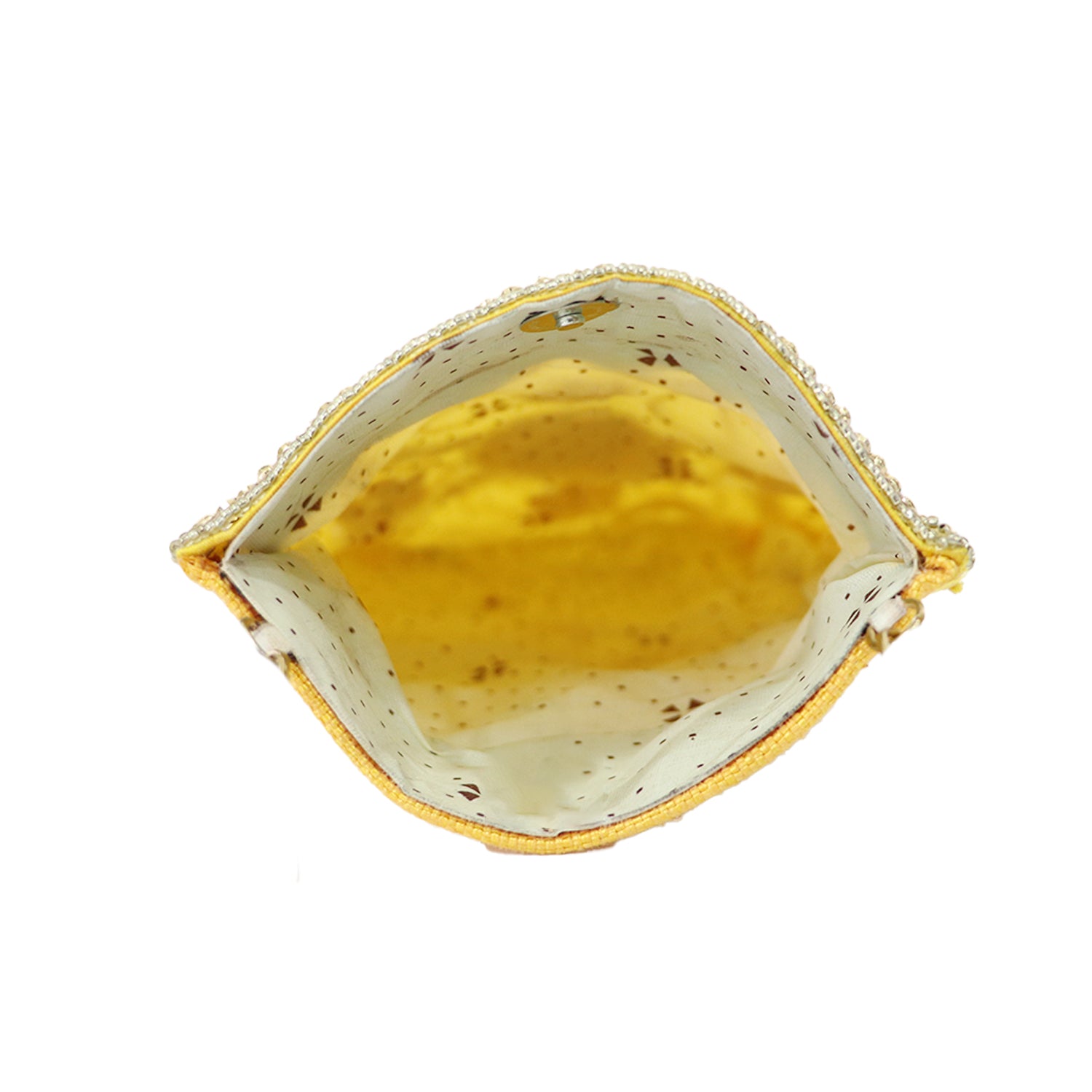 A vibrant yellow mobile pouch designed with intricate beadwork and decorative embellishments. Compact and stylish, this pouch is perfect for carrying your phone and essentials
