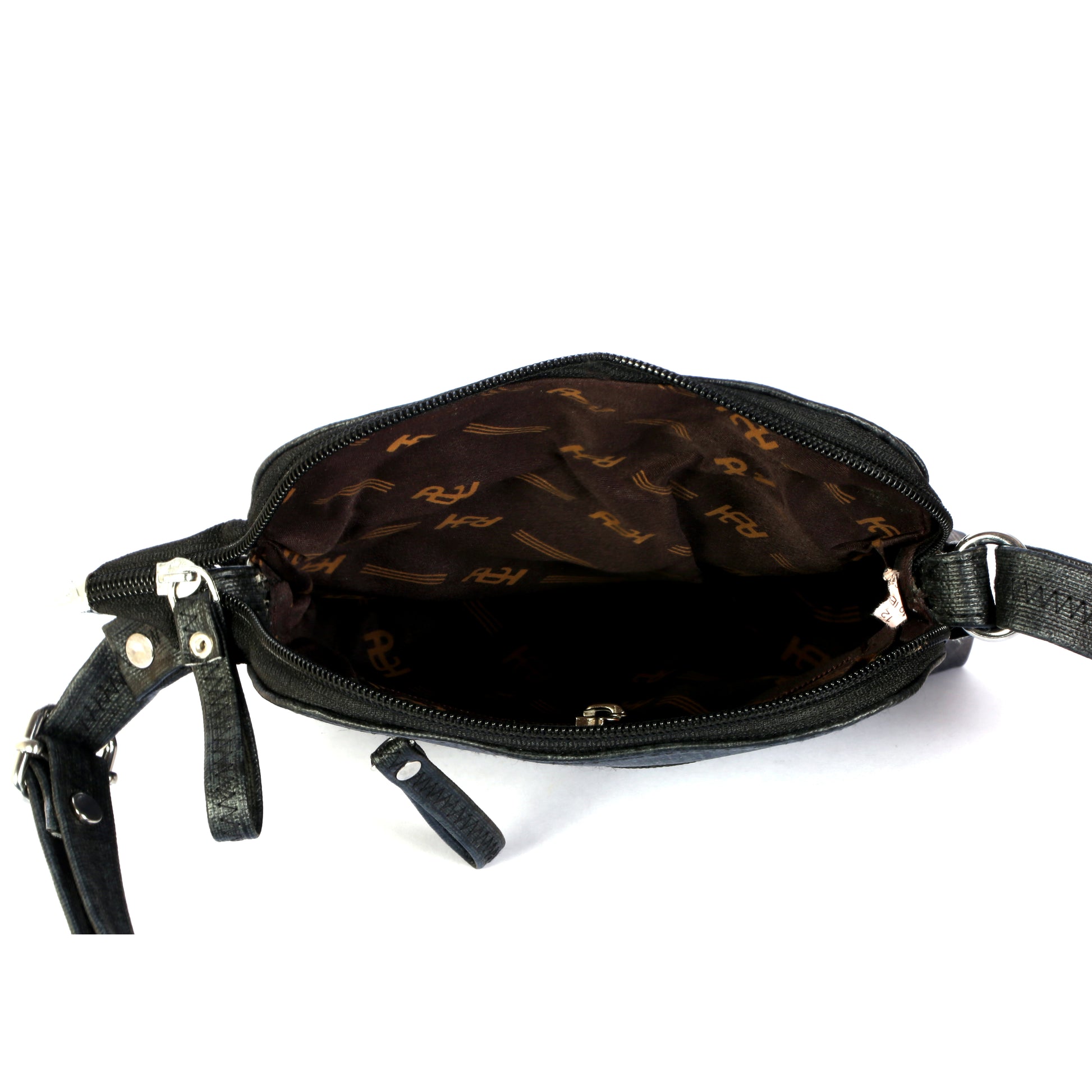 Stylish and functional black crossbody sling bag designed for everyday use. Features multiple zip pockets for organized storage, durable material, and an adjustable shoulder strap for comfortable carrying. Ideal for travel, daily outings, and casual use.